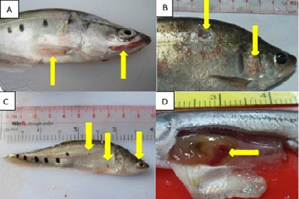 - Dấu hiệu bệnh lý: Tùy vào các giai đoạn nuôi, ở giai đoạn giống biểu hiện đầu tiên là chướng hơi, ủ khuẩn tiếp đếm sẽ có dấu hiệu xuất huyết ở vây, xuất hiện nhiều chấm đỏ vùng vây, khi giải phẩu gan, thận và tỳ tạng có biến đổi chủ yếu gồm xung huyết, xuất huyết và hoại tử. Cấu trúc mô da cơ thì không có sự thay đổi. Ở giai đoạn cá nuôi thịt sẽ có hiện tượng bội nhiễm, biểu hiện tương tự giai đoạn giống tuy nhiên trước đó cá ăn kém bơi lờ đờ hay tấp vào bờ, các chấm đỏ ở vây xuất hiện khá rõ ràng.