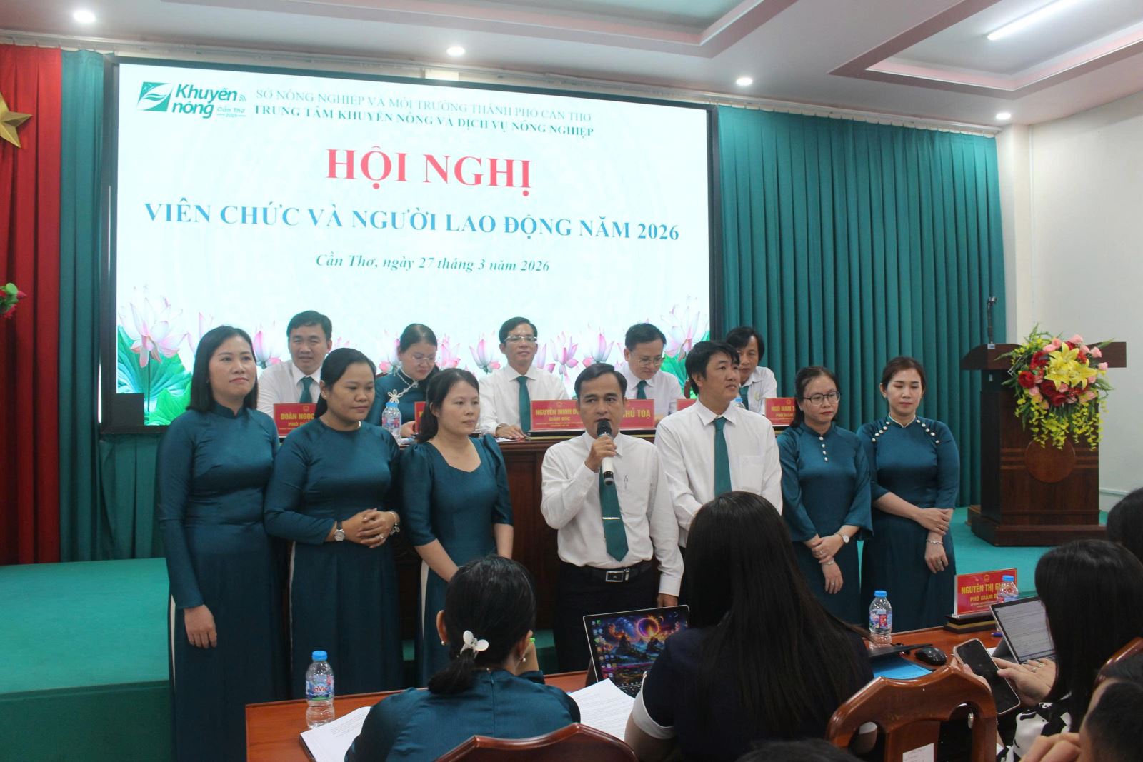 Ngày 27/3/2026, Trung tâm Khuyến nông và Dịch vụ nông nghiệp thành phố Cần Thơ tổ chức Hội nghị viên chức, người lao động năm 2026. Đến dự và chỉ đạo có bà Nguyễn Thị Giang – Phó Giám đốc Sở Nông nghiệp và Môi trường thành phố Cần Thơ; ông Nguyễn Minh Đức – Giám đốc Trung tâm; cùng tập thể Ban Giám đốc và toàn thể gần 200 viên chức, người lao động của Trung tâm.